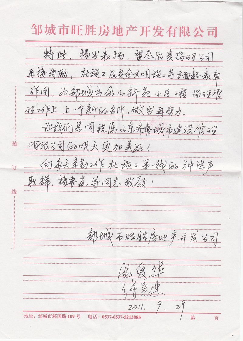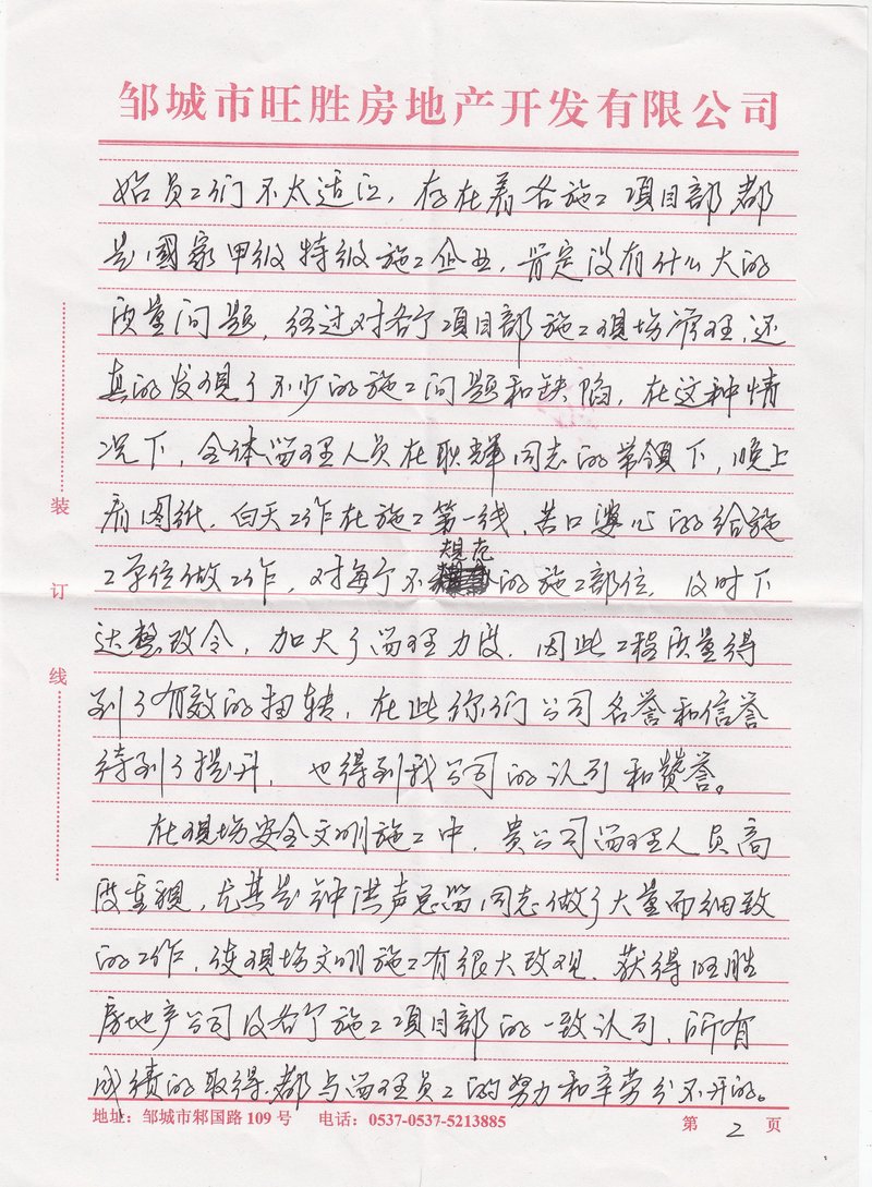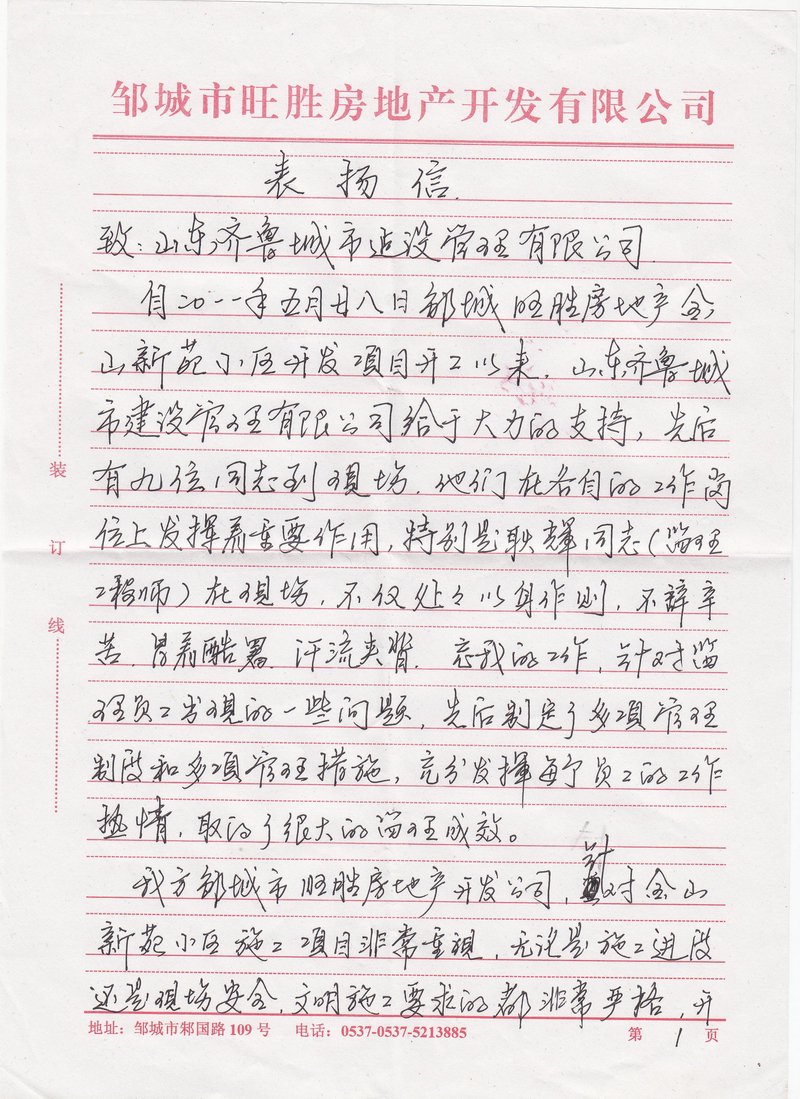 我方鄒城市旺勝房地產(chǎn)開發(fā)公司,針對金山新苑小區(qū)施工項(xiàng)目非常重視,無論是施工進(jìn)度還是現(xiàn)場安全,文明施工要求的都非常嚴(yán)格。開始員工們不太適應(yīng),存在著各施工項(xiàng)目部都是國家甲級特級施工企業(yè),肯定沒有什么大的質(zhì)量問題,經(jīng)過對各個項(xiàng)目部施工現(xiàn)場管理,還真的發(fā)現(xiàn)了不少的施工問題和缺陷,在這種情況下,全體監(jiān)理人員在耿輝同志的帶領(lǐng)下,晚上看圖紙,白天工作在施工第一線,苦口婆心的給施工單位做工作,對每個不規(guī)范的施工部位,及時下達(dá)整改令,加大了監(jiān)理力度。因此工程質(zhì)量得到了有效的扭轉(zhuǎn),在此你們公司名譽(yù)和信譽(yù)得到了提升,也得到我公司的認(rèn)可和贊譽(yù)。