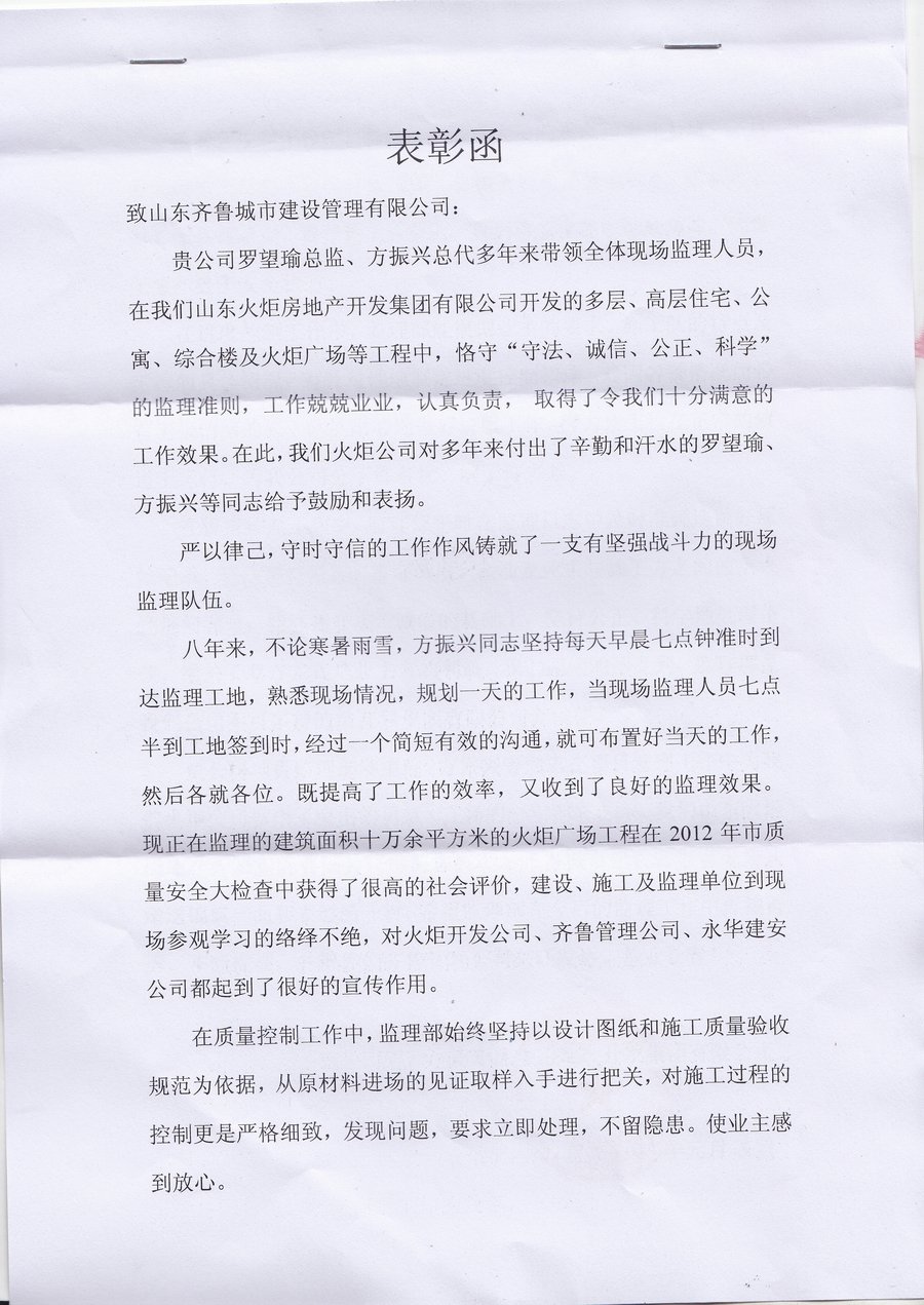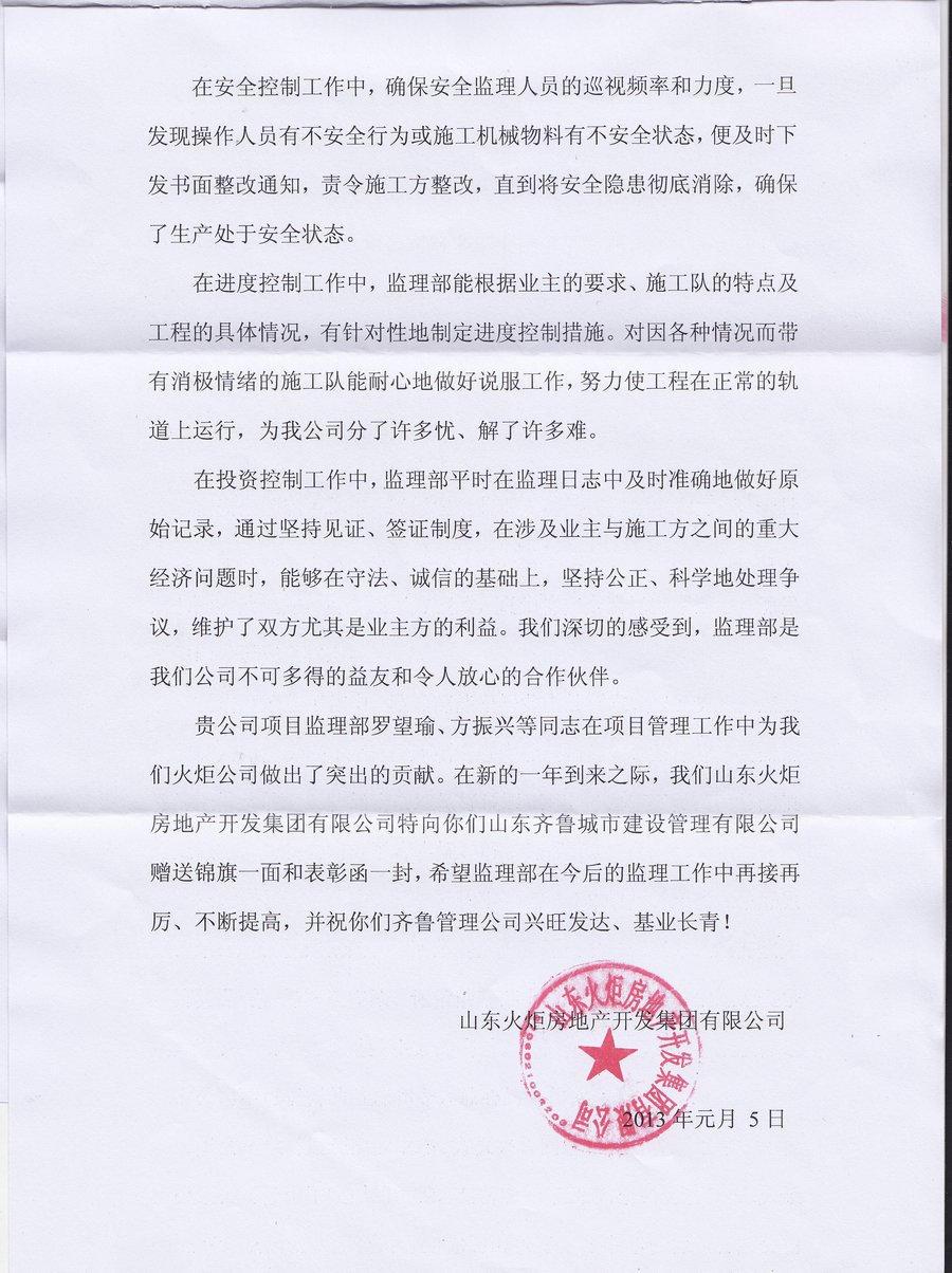 2013年元月五日,火炬房地產(chǎn)集團(tuán)張海青副總、孔偉總工、宮紅濤經(jīng)理一行五人來到山東齊魯城市建設(shè)管理有限公司,為感謝火炬廣場項(xiàng)目監(jiān)理部送來感謝信及錦旗,受到齊魯管理王華董事長熱情接待。