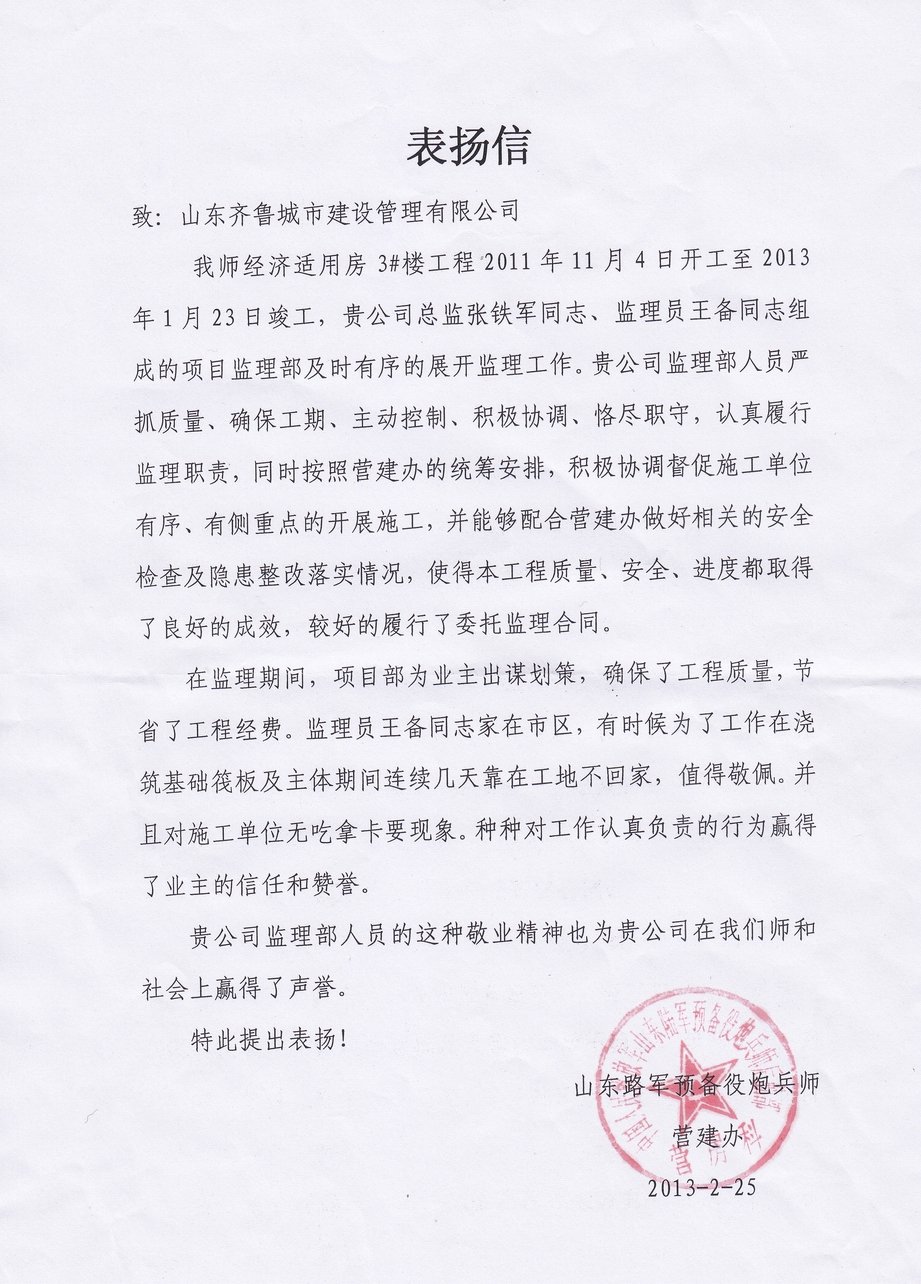 貴公司監(jiān)理部人員的這種敬業(yè)精神也為貴公司在我們師和社會(huì)上贏得了聲譽(yù)。