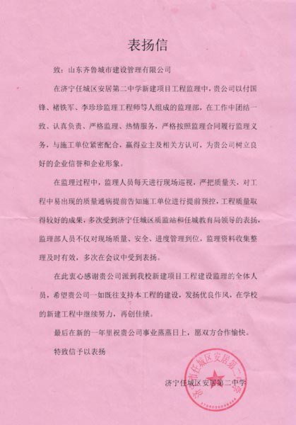 2018年2月5日,濟寧任城區(qū)安居第二中學新建項目負責人謝主席前來我公司,為我公司送來一面印有“用心保證質(zhì)量 創(chuàng)新服務(wù)業(yè)主”的錦旗。表彰我公司以付國鋒、褚鐵軍、李珍珍監(jiān)理工程師等人組成的監(jiān)理部在濟寧任城區(qū)安居第二中學新建項目工程監(jiān)理中,對工程認真負責、嚴格監(jiān)理、熱情服務(wù)的態(tài)度。宋德望副總經(jīng)理、杜紹坤副總經(jīng)理接待了謝主席,表示能夠得到領(lǐng)導(dǎo)的肯定,是對我們公司監(jiān)理人員的高度評價,今后監(jiān)理部的人員將以更加飽滿的熱情投入到工程后期的工作中去。