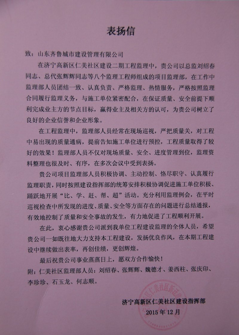 2016年1月20日濟(jì)寧高新區(qū)王因鎮(zhèn)人民政府仁美社區(qū)二期項(xiàng)目指揮部高主任、董主任及技術(shù)負(fù)責(zé)人趙工,一行三人來(lái)我公司,為我公司送來(lái)一面印有“公正不阿 業(yè)主滿意 恪盡職守 監(jiān)理楷模”的錦旗,以表彰我公司駐濟(jì)寧高新區(qū)仁美社區(qū)二期劉紹春項(xiàng)目監(jiān)理部對(duì)工程認(rèn)真負(fù)責(zé)、嚴(yán)格監(jiān)理的態(tài)度。杜紹坤副總、李樹(shù)玉總工、趙德沖主任親自接待了高主任一行,表示能夠得到指揮部領(lǐng)導(dǎo)的肯定,是對(duì)我們公司監(jiān)理人員的高度評(píng)價(jià),今后監(jiān)理部的人員將以更加飽滿的熱情投入到工程后期的工作中去。