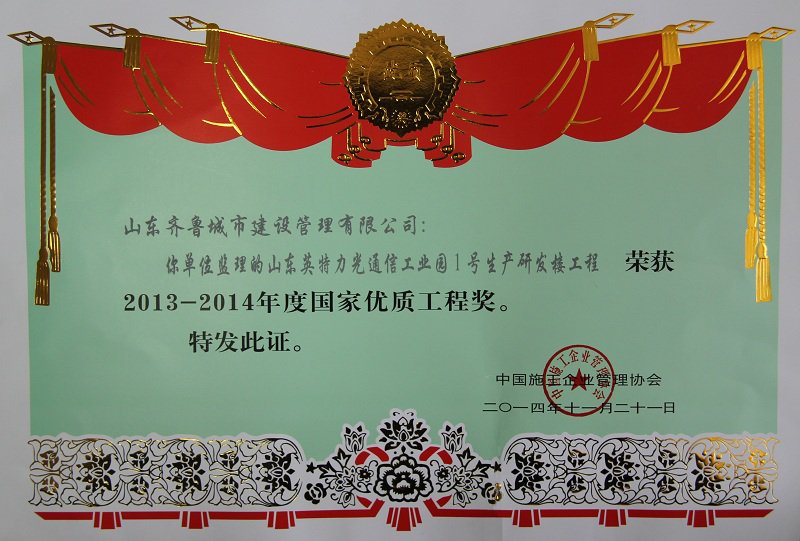 12月25日,由我公司一分公司監(jiān)理的英特力1#研發(fā)樓項目榮膺“2013-2014國家優(yōu)質(zhì)工程獎”。一分公司劉紹春經(jīng)理親赴北京,代表我公司領(lǐng)獎。