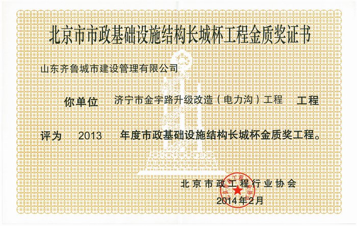 近日,我公司監(jiān)理的濟寧市金宇路升級改造(電力溝)工程,被北京市政工程行業(yè)協(xié)會評選為2013年度北京市市政基礎設施結構長城杯金質獎工程!