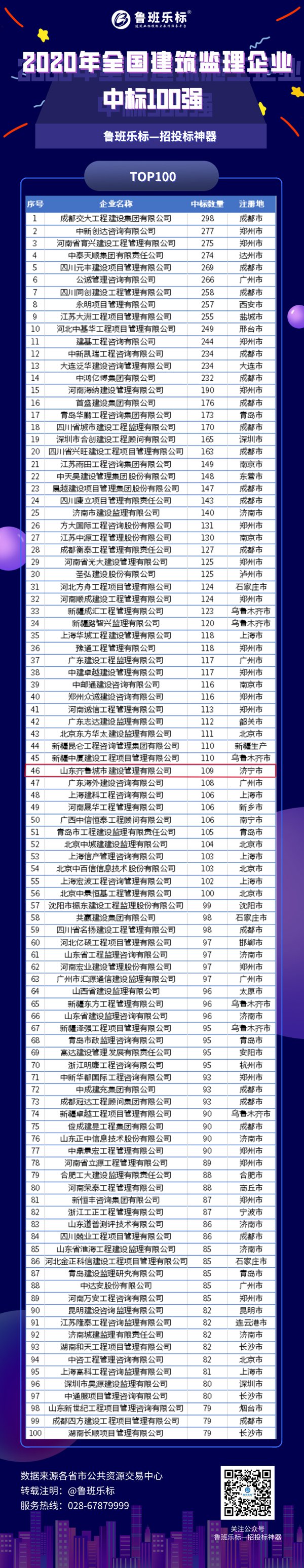 熱烈祝賀我公司名列2020年全國建筑監(jiān)理企業(yè)中標(biāo)100強(qiáng)第46位
