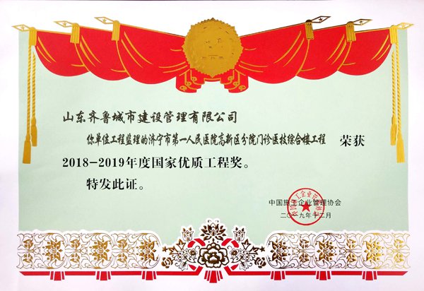 我公司監(jiān)理的濟(jì)寧市文化中心鋼結(jié)構(gòu)工程,榮獲第十三屆第二批中國鋼結(jié)構(gòu)金獎;濟(jì)寧市第一人民醫(yī)院高新區(qū)分院門診醫(yī)技綜合樓項目,榮獲2018-2019年度國家優(yōu)質(zhì)工程獎。