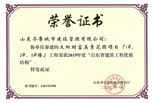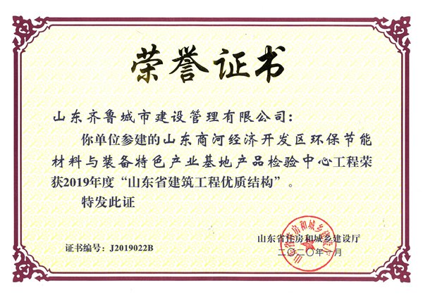 榮獲山東省優(yōu)質(zhì)結(jié)構(gòu)工程2項,分別是山東商河經(jīng)濟(jì)開發(fā)區(qū)環(huán)保節(jié)能材料與裝備特色產(chǎn)業(yè)基地產(chǎn)品檢驗中心工程、太陽財富美景花園項目(1#、2#、5#樓)。